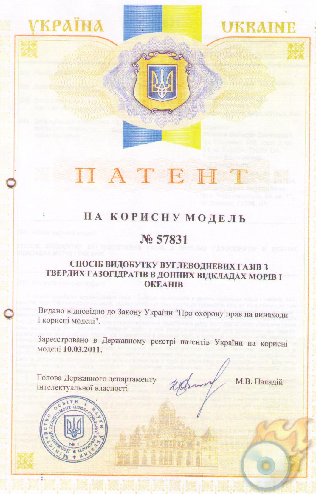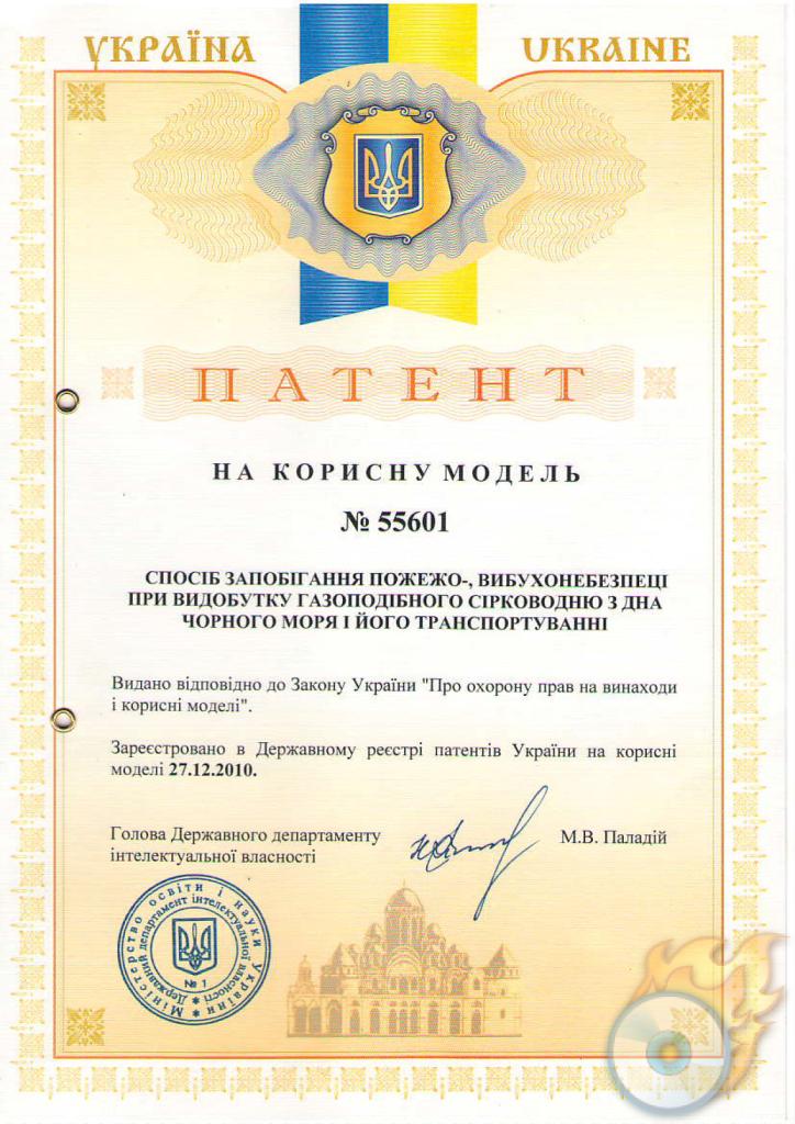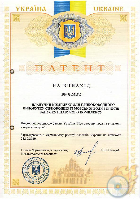 Також маємо Патент України на унікальне судно, що може перевозити як наливні так і сипучі, генеральні вантажі («Судно з танками (варіанти) та спосіб завантаження-вивантаження і транспортування вантажів на цьому судні (варіанти)»).